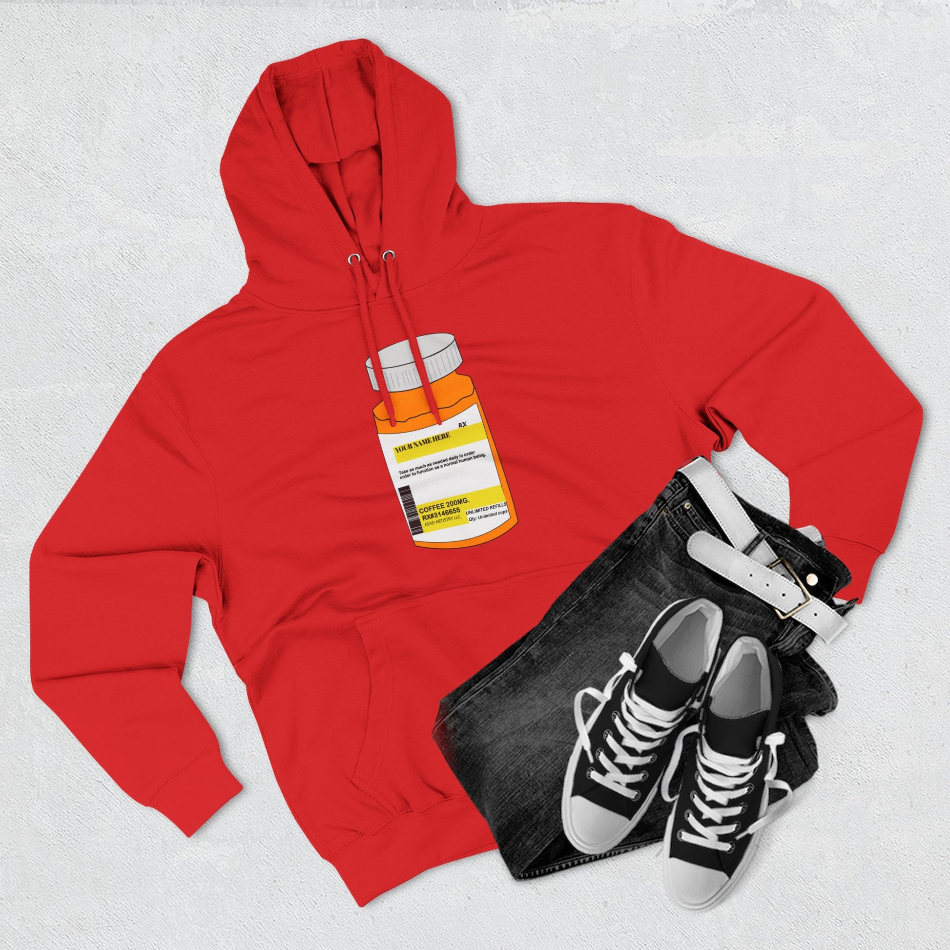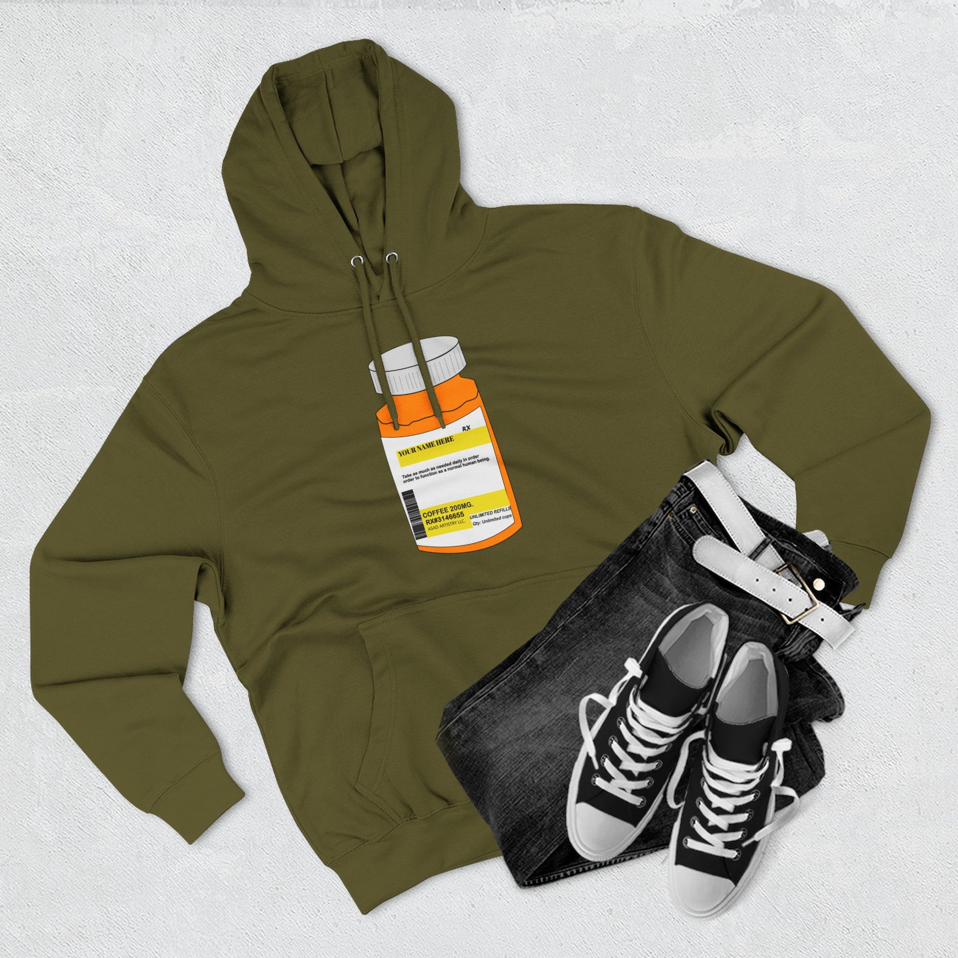 Stay warm, stylish, and a little playful with our Cozy Fleece Hoodie, featuring a unique pill bottle design with a “prescription for unlimited coffee refills” — customizable with your name for a personal touch. Made from soft, luxurious fleece, it offers a relaxed fit for comfort without compromising modest style. The adjustable hood and spacious kangaroo pocket make it perfect for chilly mornings, cozy afternoons, or reflective evenings at home.